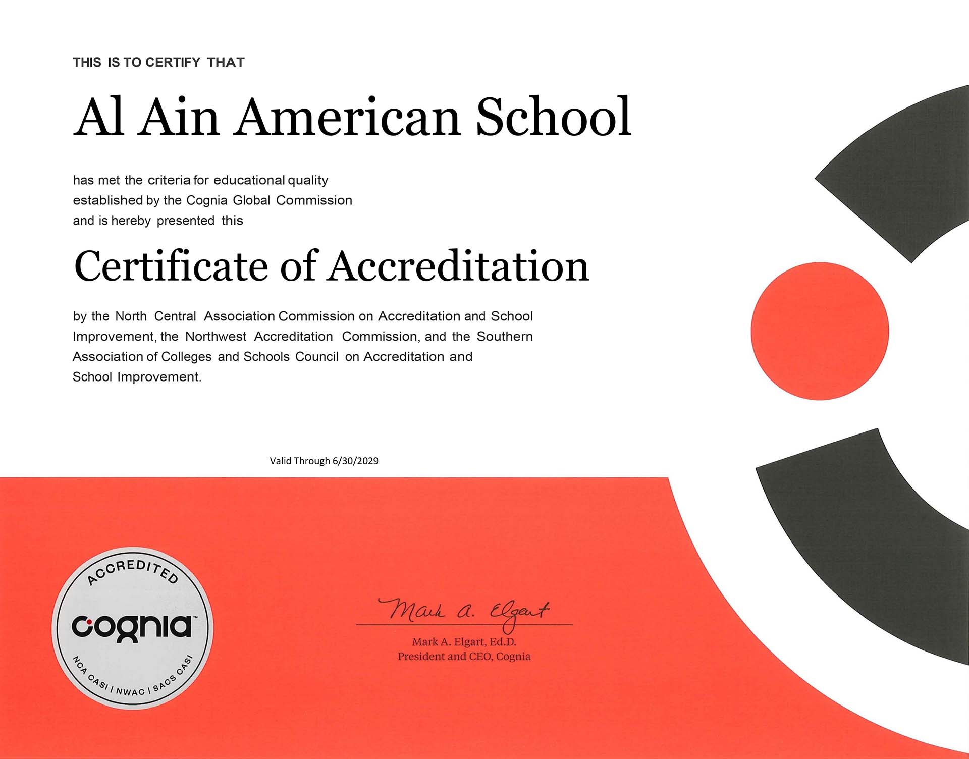 “Cognia™ accreditation is a rigorous process that focusses the entire school and its community on the primary goal of preparing lifelong learners in engaging environments where all students can flourish. Al Ain American School is to be commended for demonstrating that it has met high standards and is making progress on key indicators that impact student learning”.