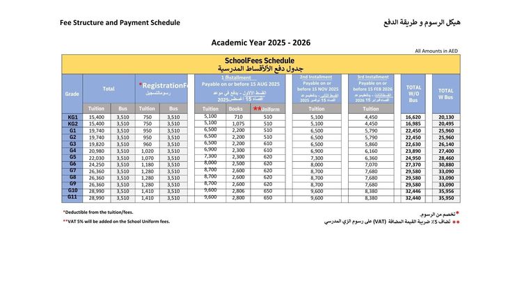 For transparency and reference, please find below the official ADEK-approved tuition fees for the Academic Year 2025–2026: